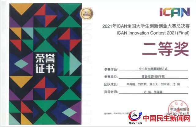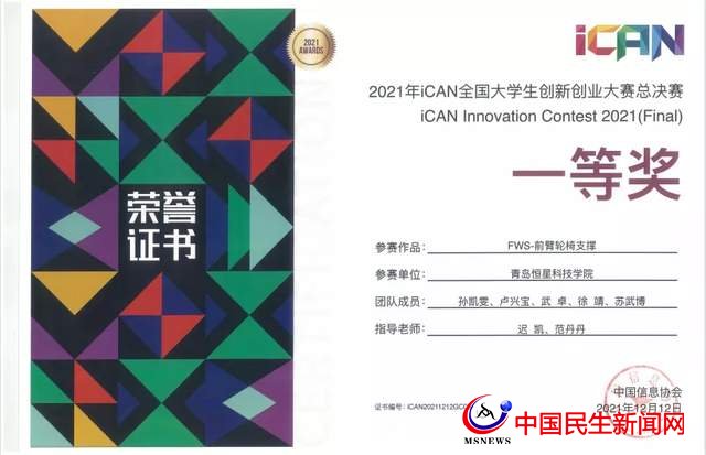 中國(guó)民生新聞網(wǎng)訊 近日,在剛剛結(jié)束的ICAN全國(guó)大學(xué)生創(chuàng)新創(chuàng)業(yè)大賽總決賽中,青島恒星科技學(xué)院參賽團(tuán)隊(duì)榮獲一等獎(jiǎng)1項(xiàng),二等獎(jiǎng)1項(xiàng),三等獎(jiǎng)1項(xiàng)的好成績(jī),突破本賽事歷史最好成績(jī)。