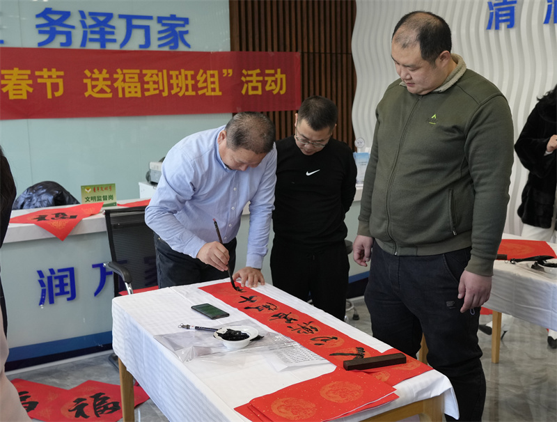 青島快訊 (通訊員 王林)“范老師,能幫我寫副春聯(lián)嗎?牟老師,可以幫我寫個‘虎福’嗎?…..” 1月24日,青島水務海潤自來水集團工會組織本單位書法愛好者們齊聚一堂開展“迎虎年春節(jié) 送福到班組”活動。旨在更好地弘揚中華民族傳統(tǒng)文化,營造喜慶歡樂、祥和平安的節(jié)日氛圍。