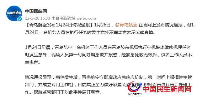 【青島航空發(fā)布1月24日情況通報】1月26日,@青島航空 在官網(wǎng)上發(fā)布情況通報,對1月24日一名機務(wù)人員在執(zhí)行任務(wù)時發(fā)生意外不幸離世表示沉痛哀悼。
