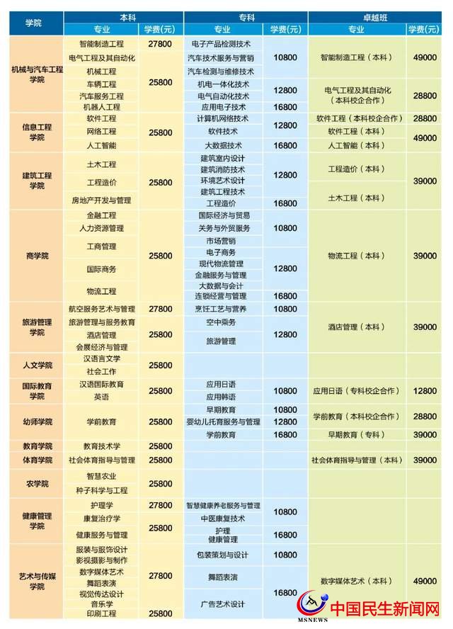 學校設有商學院、建筑工程學院、健康管理學院、國際教育學院、機械與汽車工程學院、信息工程學院、藝術與傳媒學院、幼師學院、旅游管理學院、農學院、人文學院、教育學院、體育學院、馬克思主義學院等14個二級學院。現開設本科專業(yè)40個,高職專科專業(yè)37個,涵蓋工學、管理學、藝術學等9個學科門類,形成了以工學、管理學為主,多學科協(xié)調發(fā)展的學科專業(yè)布局。目前學校建有2個省級一流本科專業(yè),4個省民辦本科高校優(yōu)勢特色專業(yè)。2021年學校入選山東省第二批應用型本科高校建設單位。