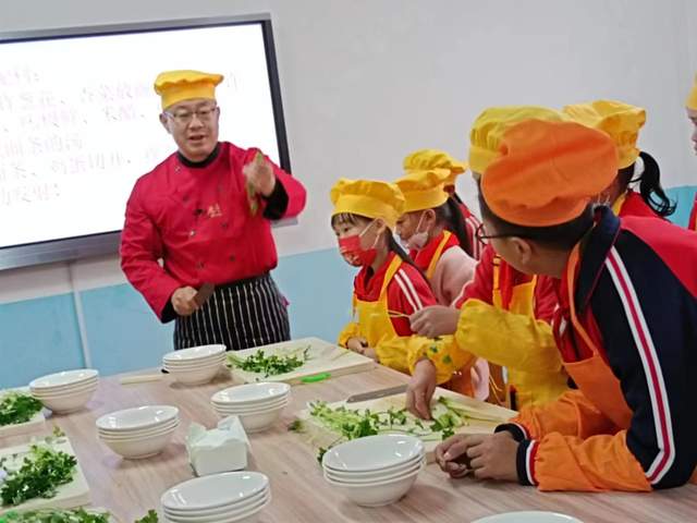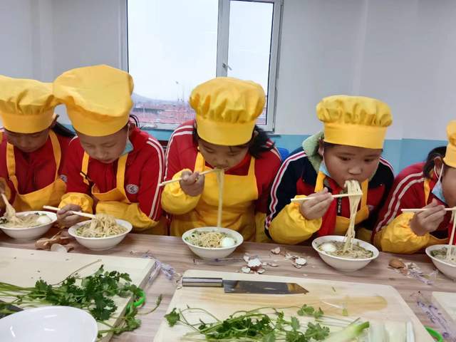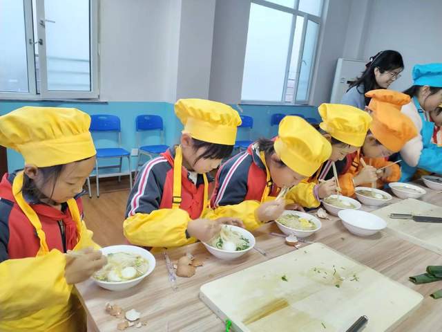 接下來,校長從握刀、切菜到煮面的火候、時長再到調(diào)料的搭配,每一個環(huán)節(jié)都耐心地講解,手把手地示范著。孩子們專心地聽講,認(rèn)真地練習(xí),從一開始的小心翼翼到后來的熟練操作,在練習(xí)中樹立了信心。