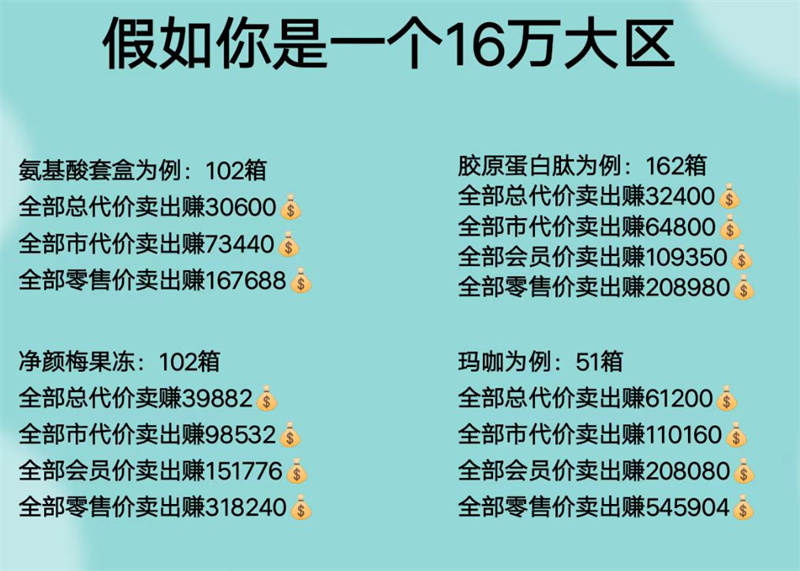 據(jù)經(jīng)銷商介紹,若自己是大區(qū),招到大區(qū),公司就會下發(fā)平級返利,不同產(chǎn)品的平級返利補貼也有所不同。比如蛹蟲草瑪咖片,一盒返利10塊錢,如果自己推薦的大區(qū)拿了一萬盒的瑪咖片,自己能拿到的平級返利就是十萬元;再比如縱美水光霜,一盒該產(chǎn)品的平級返利為5塊錢。