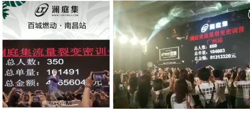 回首最近幾年,瀾庭集在推廣市場這一層面已經(jīng)達到了相當(dāng)火爆的程度,據(jù)公開資料顯示,在2018年開展的團隊精英裂變密訓(xùn)會上,瀾庭集的經(jīng)銷商們就拿到了不俗的業(yè)績。比如南昌站,兩天的時間內(nèi),350人就創(chuàng)造了四千六百萬的成交額;又比如廣州站,該站再創(chuàng)新高,800人成交了八千多萬的業(yè)績。