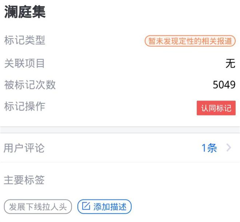 眼下,在騰訊靈鯤金融風(fēng)險監(jiān)管平臺上,“瀾庭集”這個關(guān)鍵詞已經(jīng)被標(biāo)記了5049次,雖然標(biāo)記類型是“暫未發(fā)現(xiàn)定性的相關(guān)報道”,但其主要標(biāo)簽有“發(fā)展下線拉人頭”的字樣。