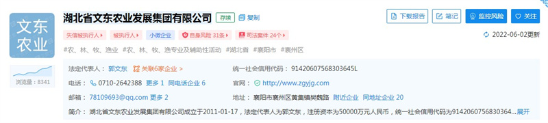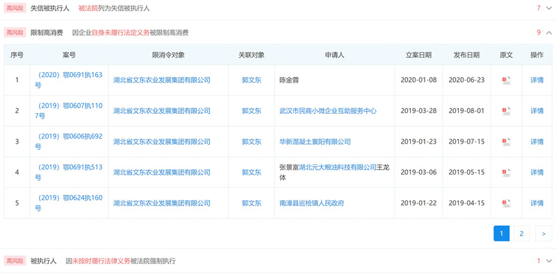 據(jù)調查,郭文東旗下有6家企業(yè),其中包括湖北省文東農業(yè)發(fā)展集團有限公司。該企業(yè)自身風險不斷,在2020年度襄陽市食品生產企業(yè)雙隨機監(jiān)督抽查中被抽查發(fā)現(xiàn)問題。而郭文東作為該企業(yè)的法定代表人,多次被列為失信執(zhí)行人,且因企業(yè)自身未履行法定義務被限制高消費,還因未按時履行法律義務被法院強制執(zhí)行。