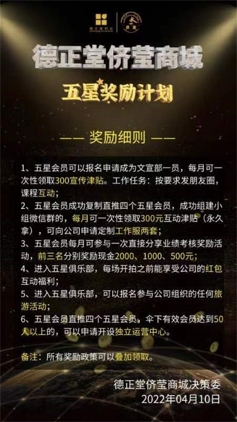 2022年4月10日,為了進(jìn)一步刺激市場(chǎng),“德正堂儕瑩商城決策委”還發(fā)布了《德正堂儕瑩商城五星獎(jiǎng)勵(lì)計(jì)劃》: