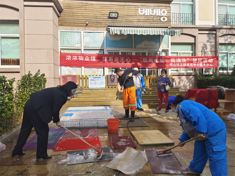 本網(wǎng)訊 枝葉總關(guān)情,服務(wù)腳下起。作為家家戶戶的必備品,地墊很容易臟,又不好洗、晾曬難。為了更好地幫業(yè)主解憂,營造潔凈的生活環(huán)境,10月27日,嶗山區(qū)環(huán)衛(wèi)園林總公司下屬物業(yè)公司在頤景園小區(qū)舉辦“濃濃物業(yè)情、情系業(yè)主心”——您用地墊,我清洗便民服務(wù)活動。
