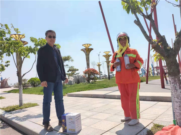“水兵藍(lán)”品牌創(chuàng)始人周學(xué)禮說:“五一節(jié)期間,這些環(huán)衛(wèi)工作還一直戰(zhàn)斗在一線,為了能讓游客看到潔凈的馬路,他們一直在做著重復(fù)的勞動,非常辛苦,他們是最美勞動者。自己本身是一名退役軍人,對他們的奉獻(xiàn)精神表示贊賞,用自己精釀的啤酒來慰問他們,希望給他們帶來五一的快樂時光。
