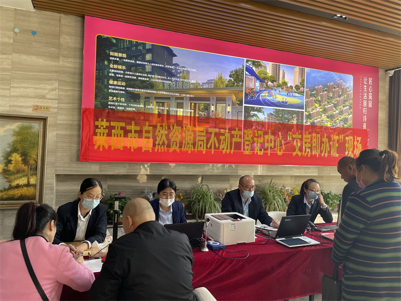 據(jù)悉,“交房即辦證”工作是萊西市學(xué)史力行,深入推進(jìn)“互聯(lián)網(wǎng)+不動(dòng)產(chǎn)登記”的一項(xiàng)重要舉措。為更好的服務(wù)企業(yè)和群眾,讓百姓買(mǎi)房省心、辦證舒心,萊西市創(chuàng)新“聯(lián)合驗(yàn)收”,統(tǒng)籌多個(gè)部門(mén)共同參與,由原來(lái)的坐等服務(wù)到現(xiàn)在的上門(mén)服務(wù),由原來(lái)“折返跑”多部門(mén)到現(xiàn)在的多部門(mén)集中辦公服務(wù),不僅壓縮了工作流程,而且減少了工作時(shí)限。在紫悅璟園小區(qū)交房現(xiàn)場(chǎng),工作人員通過(guò)“一人一機(jī)一窗”新模式受理業(yè)主不動(dòng)產(chǎn)登記申請(qǐng),經(jīng)不動(dòng)產(chǎn)登記和稅務(wù)部門(mén)后臺(tái)人員審核后,申請(qǐng)人在交房現(xiàn)場(chǎng)繳納稅費(fèi)后直接領(lǐng)到不動(dòng)產(chǎn)權(quán)證書(shū)。兩天時(shí)間,共計(jì)76戶(hù)業(yè)主在現(xiàn)場(chǎng)辦理不動(dòng)產(chǎn)登記手續(xù)并領(lǐng)取了證書(shū)。