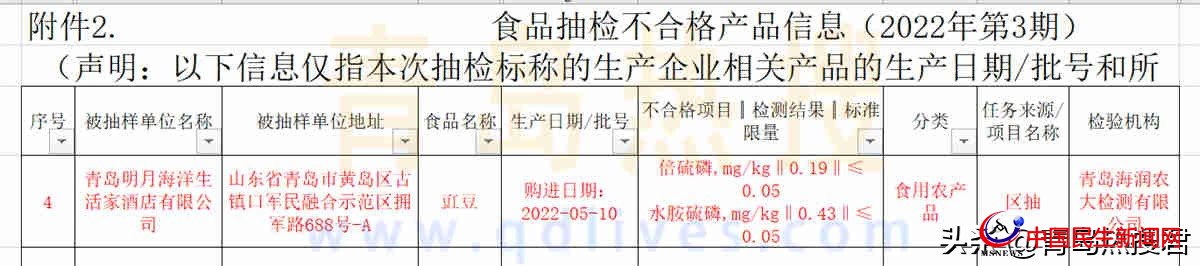 通報(bào)顯示,青島明月海洋生活家酒店有限公司采購的豇豆被檢出兩項(xiàng)農(nóng)殘超標(biāo),分別為倍硫磷檢出0.19mg/kg,是限定檢出值的近4倍,水胺硫磷0.43mg/kg,是限定檢出值的8倍多!