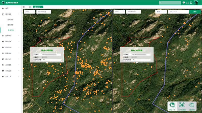 精準(zhǔn)監(jiān)管。依托航空航天專用AI中臺(tái)技術(shù),自主打造松材線蟲病空天地一體化智能監(jiān)管平臺(tái)和疫木除治信息采集APP,實(shí)現(xiàn)松材線蟲病防控工作從疫木普查、疫木除治、除治監(jiān)管、成效核查、檔案管理的全流程、閉環(huán)式實(shí)時(shí)在線監(jiān)管。