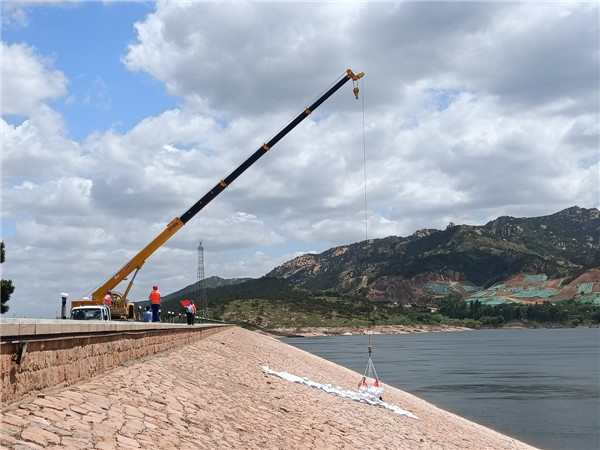 壩前護(hù)坡坍塌滑坡?lián)岆U演練現(xiàn)場,無人機(jī)空中巡檢發(fā)現(xiàn)主壩迎水坡位置出現(xiàn)坍塌滑坡,搶險隊(duì)員立即兵分兩路,一路在迎水坡鋪設(shè)土工布覆蓋滑坡體區(qū)域,用沙袋將土工布壓實(shí),另一路將沙袋搬運(yùn)至吊籠,由吊車將沙袋投放至滑坡體下方,防止坍塌及滑坡進(jìn)一步發(fā)展。經(jīng)過搶險隊(duì)員的共同努力,護(hù)坡坍塌滑坡被及時處置,險情得到有效控制。