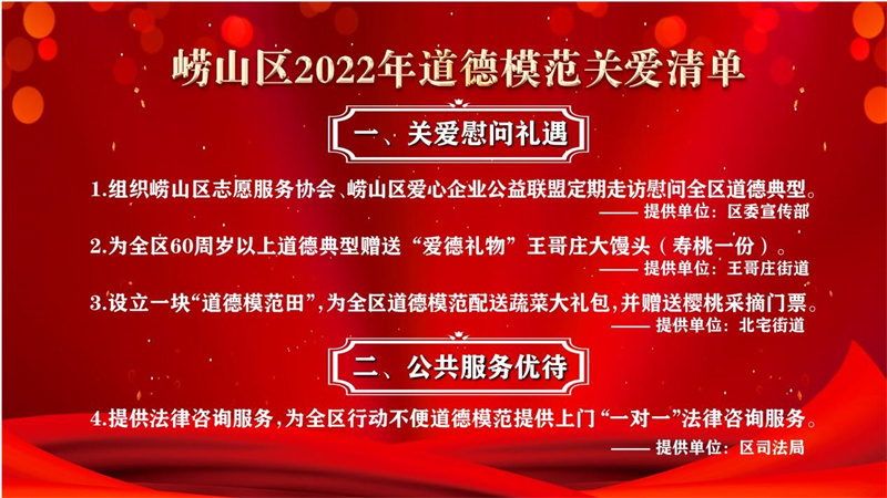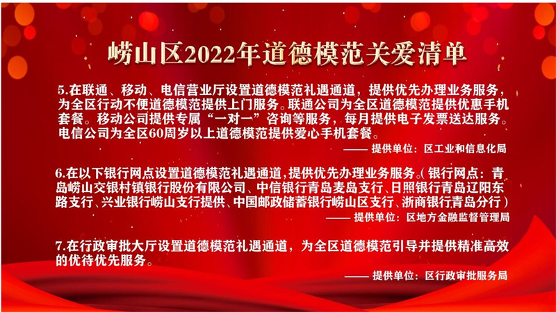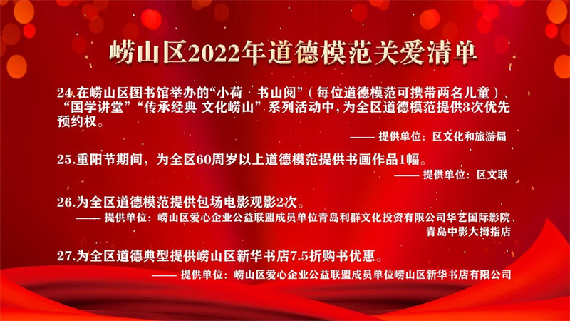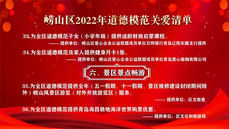 今年,嶗山區(qū)匯聚來(lái)自全區(qū)各街道、各部門(mén)、各單位、眾多愛(ài)心企業(yè)關(guān)愛(ài)聯(lián)盟成員企業(yè)的善行義舉,最終確定走訪慰問(wèn)、公共服務(wù)、醫(yī)療服務(wù)、資金幫扶、教育文化和游覽景點(diǎn)等六大板塊、總計(jì)36項(xiàng)道德模范關(guān)愛(ài)舉措。2022年5月1日起,嶗山區(qū)將集中開(kāi)展“道德模范關(guān)愛(ài)月”活動(dòng),道德模范可憑“嶗·好人卡”享受各項(xiàng)關(guān)愛(ài)服務(wù),在全社會(huì)進(jìn)一步形成尊重、關(guān)愛(ài)、禮遇道德模范的濃厚氛圍,樹(shù)立崇德尚禮、見(jiàn)賢思齊的價(jià)值導(dǎo)向。