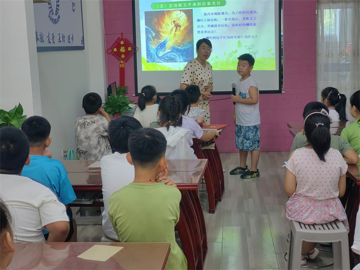 活動創(chuàng)新采用“動漫+普法”的形式,雷音講師以熱映電影《哪吒之魔童鬧?!窞榍腥朦c,巧妙提取“我命由我不由天”“打破偏見”等青少年熟悉的網(wǎng)絡熱詞,將民法典中的人格權、正當防衛(wèi)等法律知識融入生動有趣的故事情節(jié)。并結合“陳塘關村民排斥哪吒”“哪吒重拳出擊東海龍宮”等案例,深入淺出地講解了與青少年生活息息相關的法律知識,引發(fā)了孩子們“原來動畫片里藏著這么多法律知識”的陣陣驚嘆。