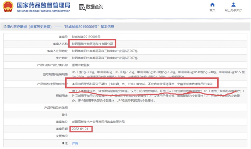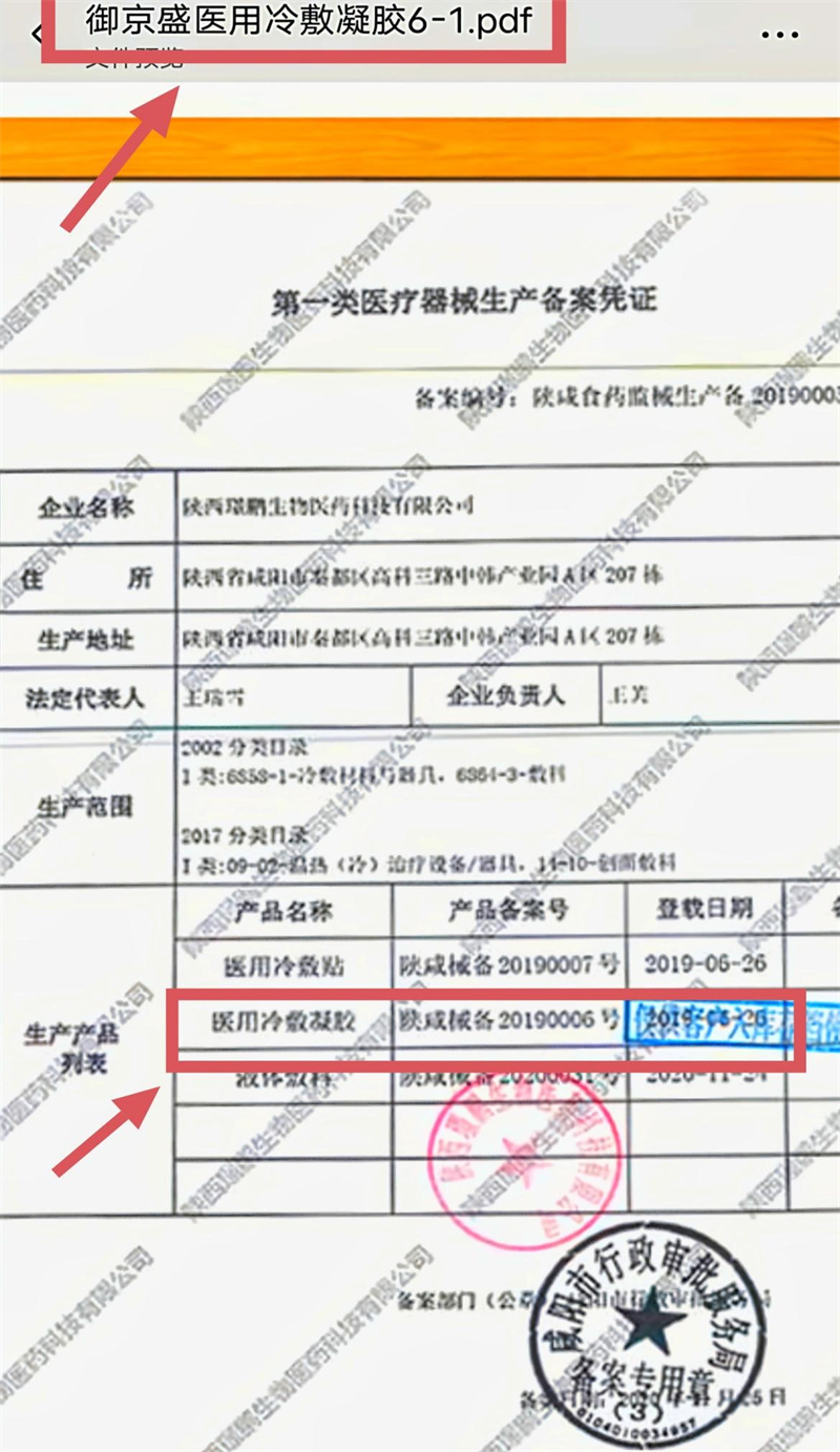由代理提供的產(chǎn)品備案信息可看到,“御京盛·醫(yī)用冷敷凝膠”的產(chǎn)品備案號(hào)為:陜咸械備20190006號(hào)。在國家藥品監(jiān)督管理局官網(wǎng)查詢?cè)搨浒柑?hào)得到的信息是,該產(chǎn)品的備案人是陜西璟鵬生物醫(yī)藥科技有限公司,備案日期是2022年4月21日,也就是說,該產(chǎn)品是陜西璟鵬生物醫(yī)藥科技有限公司代加工生產(chǎn)的。并且,該產(chǎn)品屬于第一類醫(yī)療器械,由鋁塑瓶和高分子凝膠(卡波姆、水、甘油)等組成,不應(yīng)含有發(fā)揮藥理學(xué)、免疫學(xué)或者代謝作用的成分。用于人體物理退熱、體表面特定部位的降溫,僅用于閉合性軟組織,適用于眼部的冷敷理療。由此可見,“御京盛·醫(yī)用冷敷凝膠”并不具備其所宣傳的治療各種眼疾、近視的效果,其有關(guān)宣傳材料明顯存在醫(yī)療器械廣告宣傳的功能主治、適用范圍超出了批準(zhǔn)的內(nèi)容,含有不科學(xué)地表示功效的斷言和保證,嚴(yán)重欺騙和誤導(dǎo)消費(fèi)者。
