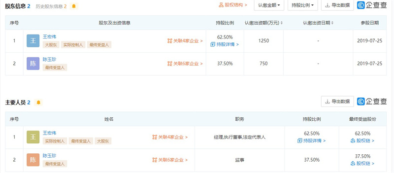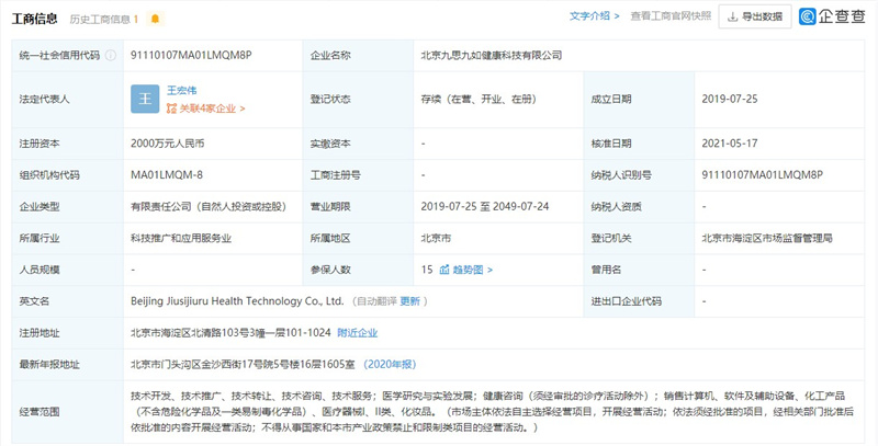 北京九思九如健康科技有限公司成立于2019年7月25日,注冊(cè)地位于北京市海淀區(qū)北清路103號(hào)3幢一層,注冊(cè)資本為2000萬元,法定代表人為王某偉。該公司由王某偉控股62.5%并擔(dān)任執(zhí)行董事兼總經(jīng)理,陳某珍持股37.5%并擔(dān)任監(jiān)事。王某偉是該公司的實(shí)際控制人盒最終受益人。