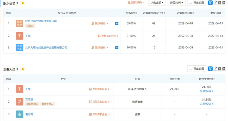 企查查APP顯示,北京住邦健康管理有限公司成立于2022年4月13日,注冊(cè)地位于北京市石景山區(qū)西井路19號(hào)院3號(hào)樓,注冊(cè)資本為100萬元,法定代表人為王某。王某擔(dān)任該公司總經(jīng)理,龍某宜擔(dān)任執(zhí)行董事,袁某高擔(dān)任監(jiān)事。該公司由北京住邦生物科技有限公司控股69%,北京九思九如健康產(chǎn)業(yè)管理有限公司持股10%,王某持股21%。北京九思九如健康產(chǎn)業(yè)管理有限公司便是九思九如集團(tuán)旗下公司之一。