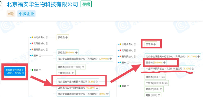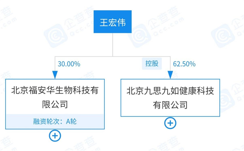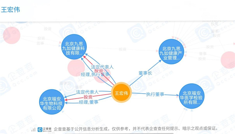 調(diào)查者從代理處獲悉,王某偉就是住邦生物科技的創(chuàng)始人。企查查APP顯示,王某偉與四家公司有關(guān)聯(lián),他不僅是北京九思九如健康科技有限公司董事長,還對(duì)外投資了北京福安華生物科技有限公司,持股30%并擔(dān)任該公司法定代表人、執(zhí)行董事兼總經(jīng)理;擔(dān)任北京九思九如健康產(chǎn)業(yè)管理有限公司董事長;擔(dān)任北京福安華醫(yī)學(xué)檢驗(yàn)所有限公司執(zhí)行董事。此外,王某偉還是中金環(huán)球投資基金集團(tuán)的核心成員。