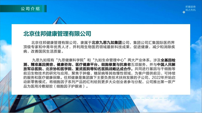 據(jù)了解,住邦生物科技的主體公司是北京住邦健康管理有限公司,北京住邦健康管理有限公司又隸屬于北京九思九如集團(tuán)。代理介紹到,集團(tuán)擁有強(qiáng)大的專家研發(fā)團(tuán)隊(duì),涉及全基因檢測(cè)、精準(zhǔn)基因美容、健康咨詢、醫(yī)療健康平臺(tái)、細(xì)胞修復(fù)與抗衰老五項(xiàng)服務(wù),中國人民某總醫(yī)院、北京某醫(yī)學(xué)院、宣武醫(yī)院等知名醫(yī)院都是其戰(zhàn)略合作伙伴。