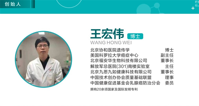 據(jù)代理宣傳,王某偉身上具有多重光環(huán)。他不僅是北京某醫(yī)院遺傳學(xué)博士,還是美國科羅拉大學(xué)癌癥中心副主任、某總醫(yī)院(301)南樓實(shí)驗(yàn)室主任、中國技術(shù)創(chuàng)辦協(xié)會(huì)質(zhì)量基礎(chǔ)聯(lián)盟理事、中國健康促進(jìn)基金會(huì)乳腺癌防治分會(huì)委員,擁有20余項(xiàng)國家及國際發(fā)明專利。