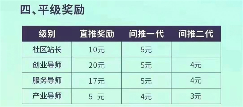 :微商代理創(chuàng)業(yè)導(dǎo)師: 自購13盒產(chǎn)品或團(tuán)隊(duì)累計(jì)購買100盒產(chǎn)品即可晉升為創(chuàng)業(yè)導(dǎo)師。創(chuàng)業(yè)導(dǎo)師享受319/盒的復(fù)購價(jià)格,銷售一盒產(chǎn)品可獲得499-319=180元銷售獎(jiǎng)勵(lì);團(tuán)隊(duì)每賣出一盒產(chǎn)品就可以獲得40元的極差獎(jiǎng)勵(lì);當(dāng)團(tuán)隊(duì)中有人達(dá)到同級(jí)時(shí),如果是直接推薦的好友,則可獲得其團(tuán)隊(duì)銷售數(shù)量20元/盒的平級(jí)獎(jiǎng)勵(lì),如果是一代的間接推廣的好友,則可獲得其團(tuán)隊(duì)銷售數(shù)量5元/盒的平級(jí)獎(jiǎng)勵(lì),二代的間接推廣的好友,則可獲得其團(tuán)隊(duì)銷售數(shù)量4元/盒的平級(jí)獎(jiǎng)勵(lì)。