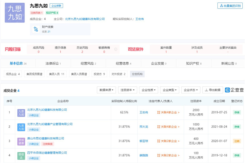 九思九如集團(tuán)旗下共有四個(gè)公司,分別是北京九思九如健康科技有限公司、北京九思九如健康產(chǎn)業(yè)管理有限公司、唐山市思如健康科技有限公司(該公司已注銷)、四平市佰信達(dá)健康管理有限公司。其中,北京九思九如健康科技有限公司是九思九如集團(tuán)的主體公司。