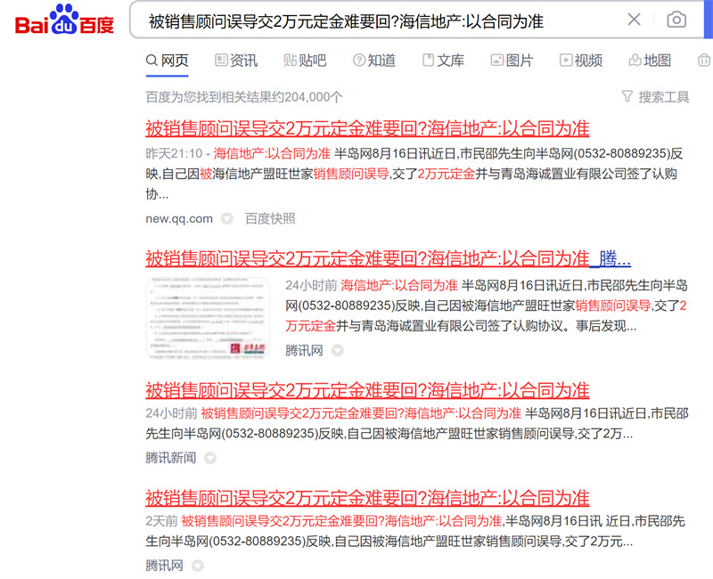 輿情 > 海信地產(chǎn)銷(xiāo)售顧問(wèn)誤導(dǎo)客戶交2萬(wàn)元定金難要回? 以合同為準(zhǔn)到底咋樣了?