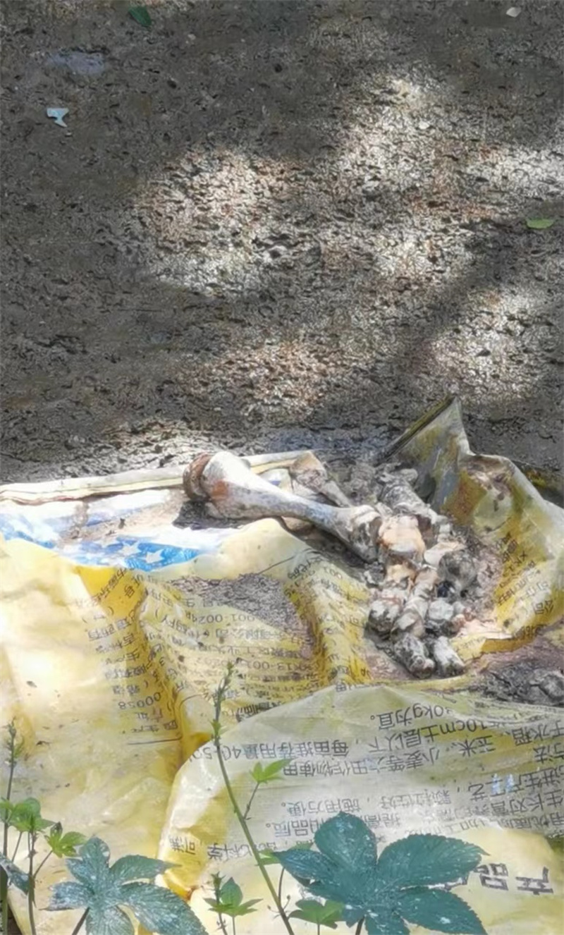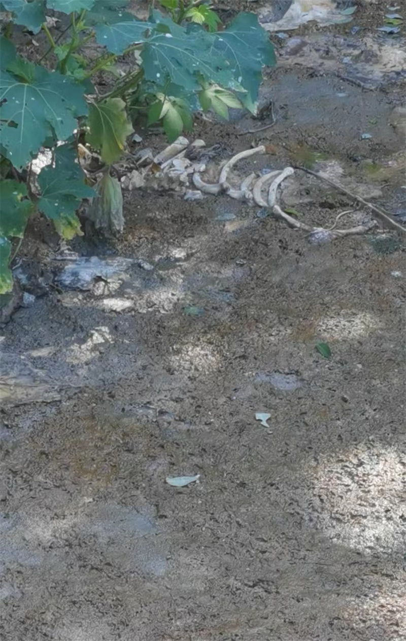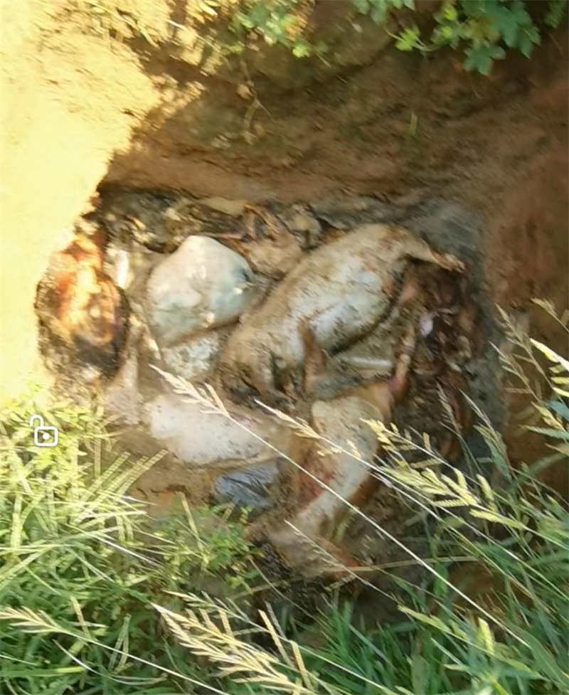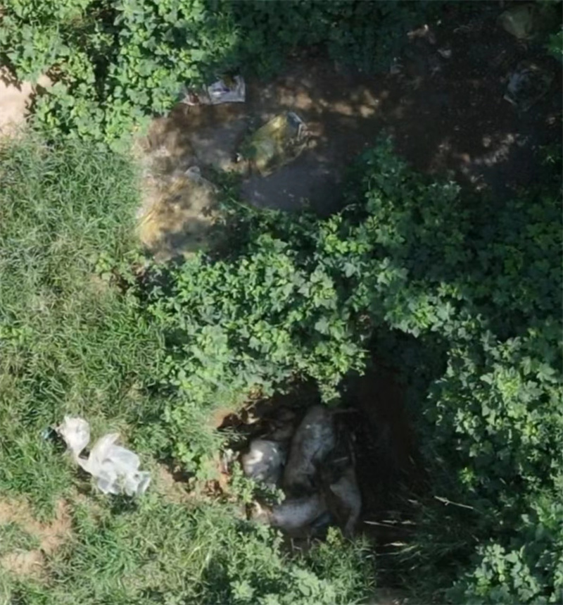 村民領(lǐng)著調(diào)查員沿著糞池東側(cè)小路繼續(xù)向北走,經(jīng)過一個(gè)養(yǎng)鴨棚再向西到養(yǎng)豬場東墻下,看到在樹木雜草掩蓋下有一個(gè)大坑,里面有七八頭死豬正在腐爛,臭氣熏天令人作嘔。村民說這坑底下有死豬,至少十幾頭。北邊還有一個(gè)坑,面積比這個(gè)坑還大,整個(gè)坑里都是已經(jīng)腐爛成黑臭狀態(tài)的液體,如果不是坑上面還漂浮著部分豬骨的話,很難分清是糞坑還是死豬腐爛到這個(gè)成程度的。村民說這就是養(yǎng)豬場處理病死豬的地方,常年如此就地挖坑往里一扔,什么時(shí)候坑滿了就蓋點(diǎn)土。村民說如果這些死豬是染病死的就應(yīng)該無害化處理,而不是這樣隨意挖坑一扔。距離死豬坑不到100米就是個(gè)養(yǎng)鴨棚,如果有疫情,這附近的養(yǎng)殖戶都要跟著倒霉了。