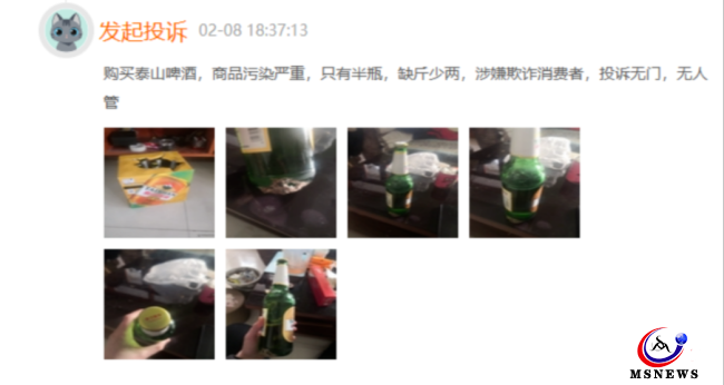 一位消費(fèi)者2月8日投訴稱,購買泰山啤酒,商品污染嚴(yán)重,只有半瓶,缺斤少兩,涉嫌欺詐消費(fèi)者,投訴無門,無人管。其后該消費(fèi)者補(bǔ)充了3次投訴信息,截至目前,該投訴僅停留在3月21日的泰山原漿啤酒回復(fù),該條投訴仍在繼續(xù)。