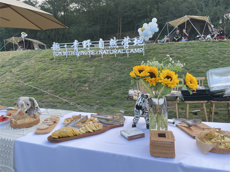 記者沉浸式體驗趣·青野 自然營地,晴朗的天空,唯美的夕陽,天幕帳篷襯著暖暖的燈光,花草點綴,桌上都是滿滿的美食,圍坐在帳篷下,望著藍天白云,一邊吃著愛心蛋糕,一邊喝著香醇的咖啡,簡直就是童話中的場景。